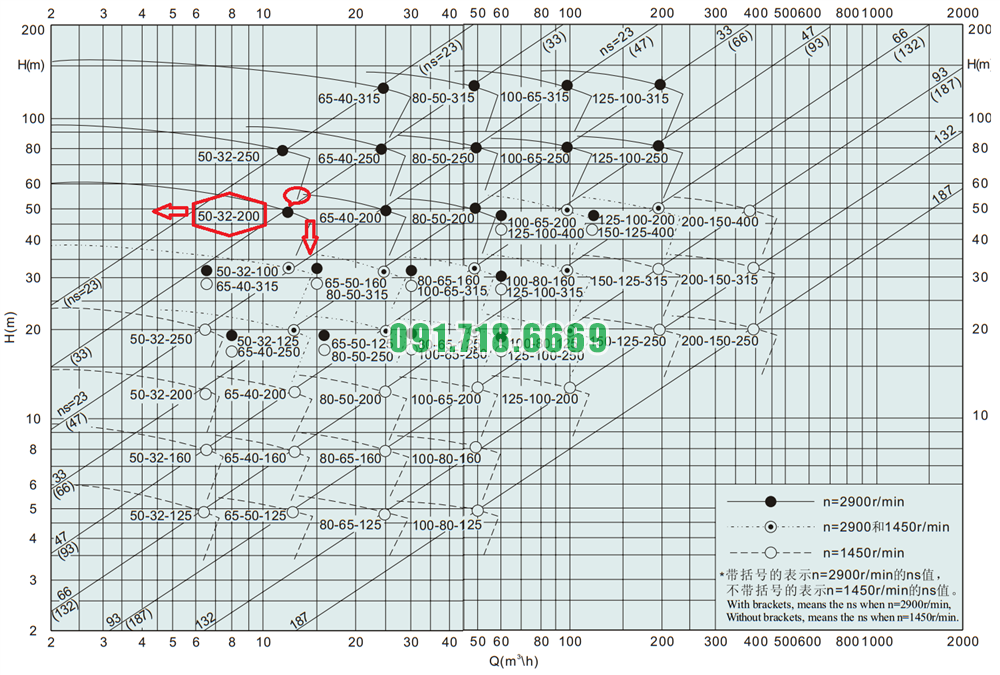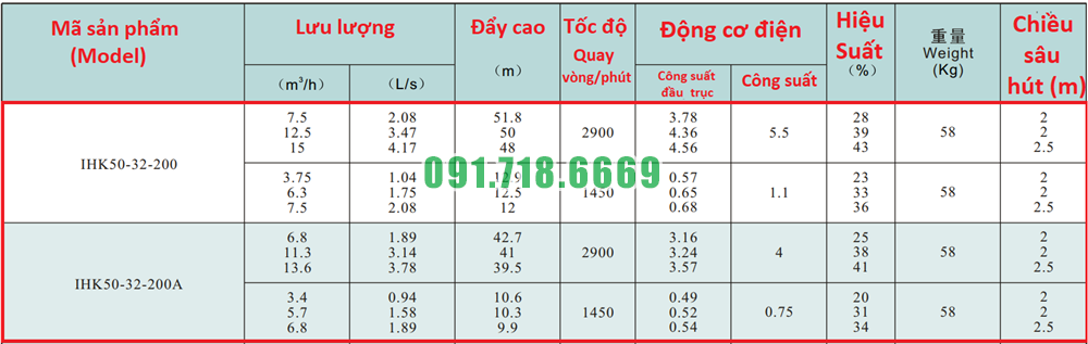 Bảng lưu lượng của bơm li tâm cánh hở đường thoát đầu vào ra Dn100 model IHK50-32-200
