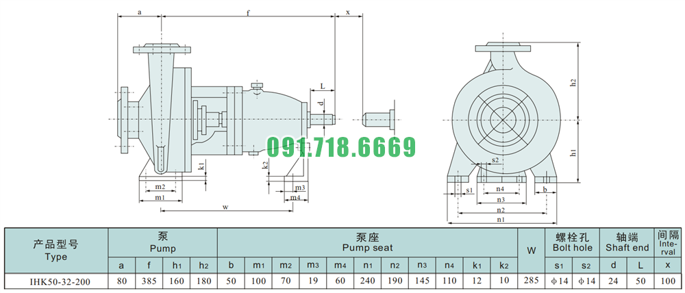 Kích thước của đầu bơm li tâm cánh hở đường thoát đầu vào ra Dn100 model IHK50-32-200