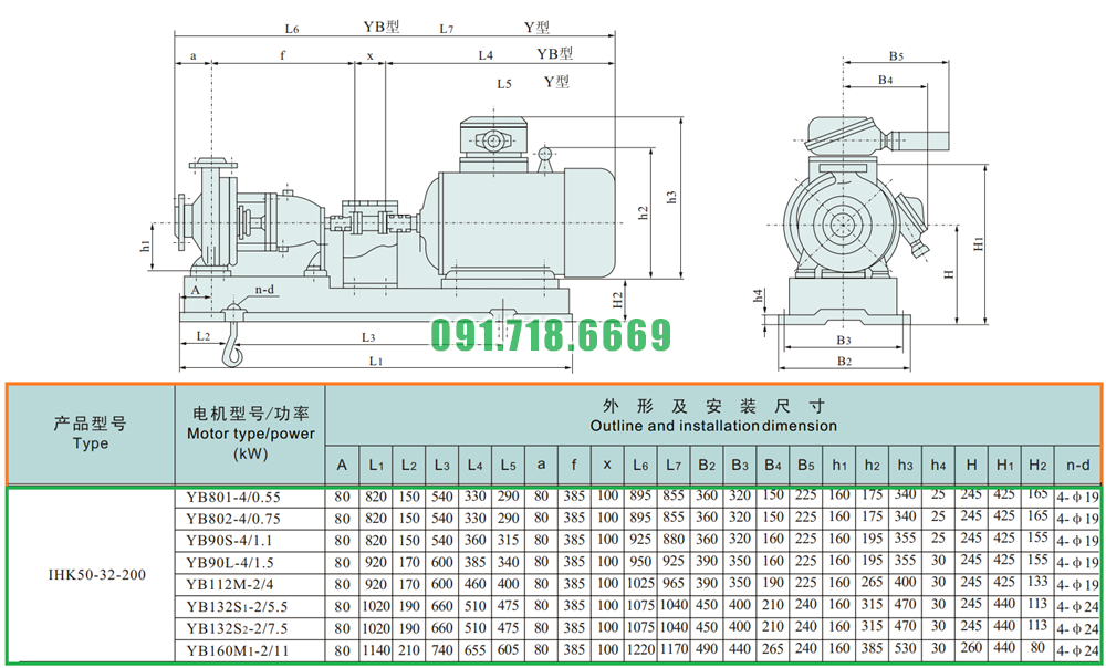 Kích thước lắp đặt của bơm li tâm cánh hở đường thoát đầu vào ra Dn100 model IHK50-32-200