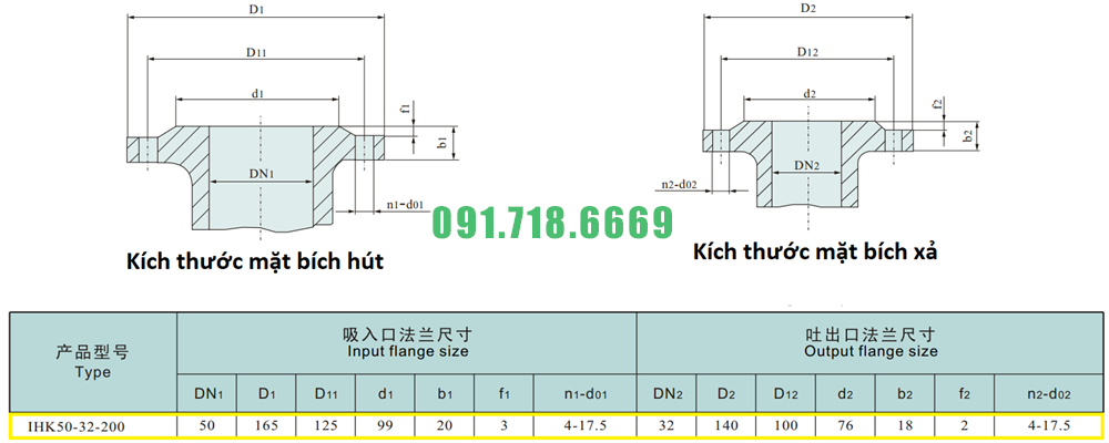 Kích thước mặt bích của bơm li tâm cánh hở đường thoát đầu vào ra Dn100 model IHK50-32-200