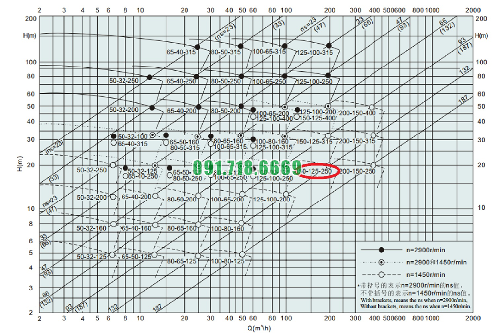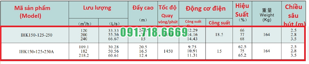 Bảng lưu lượng của bơm li tâm cánh hở đường thoát đầu vào ra Dn125 model IHK150-125-250