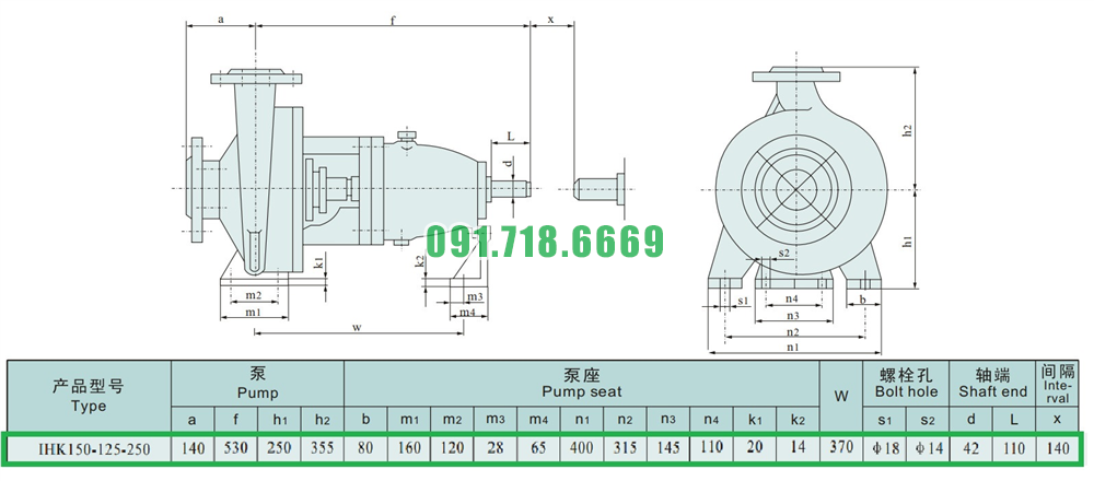 Kích thước của đầu bơm li tâm cánh hở đường thoát đầu vào ra Dn125 model IHK150-125-250