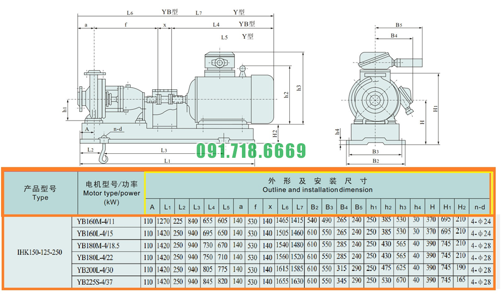 Kích thước lắp đặt của bơm li tâm cánh hở đường thoát đầu vào ra Dn125 model IHK150-125-250