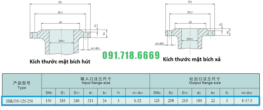 Kích thước mặt bích của bơm li tâm cánh hở đường thoát đầu vào ra Dn125 model IHK150-125-250