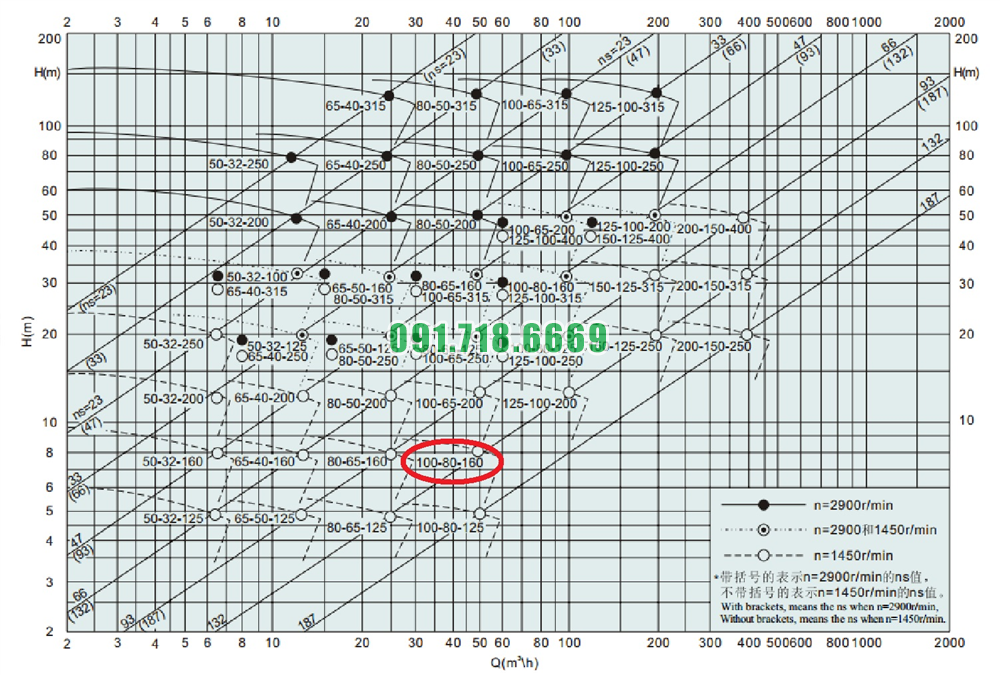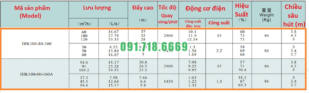 Bảng lưu lượng của bơm li tâm cánh hở vỏ inox 316L model IHK100-80-160