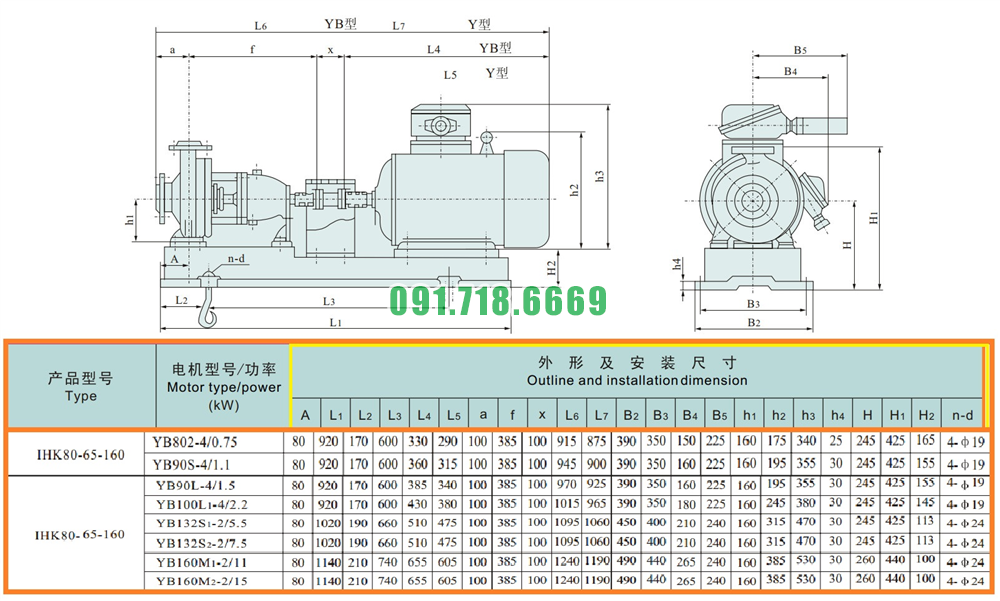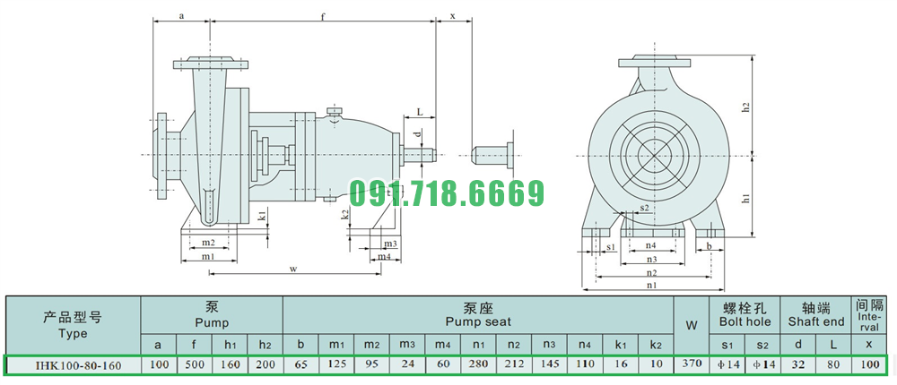 Kích thước lắp đặt của bơm li tâm cánh hở vỏ inox 316L model IHK100-80-160