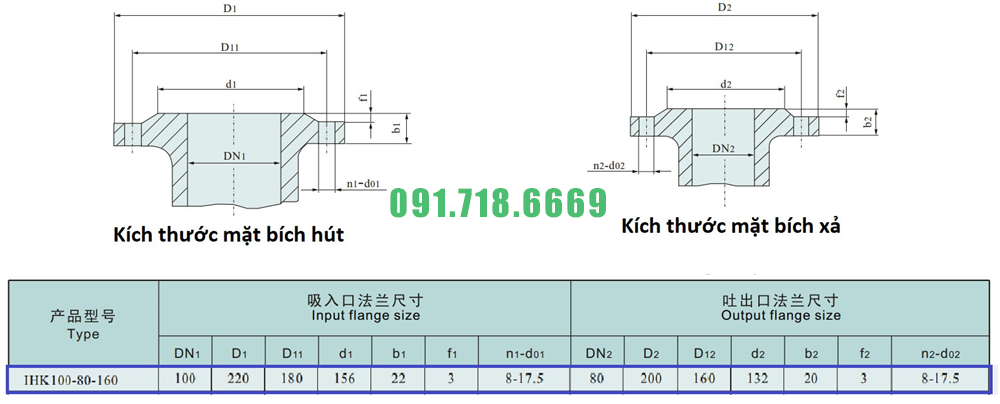 Kích thước mặt bích của bơm li tâm cánh hở vỏ inox 316L model IHK100-80-160