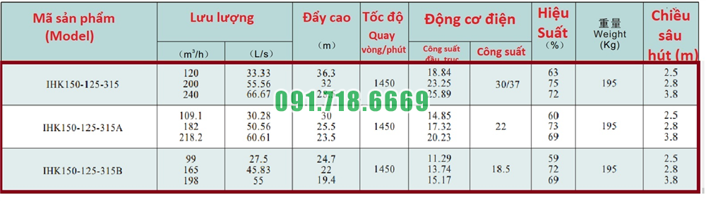 Bảng lưu lượng của bơm li tâm cánh hở vỏ inox 316L model IHK150-125-315