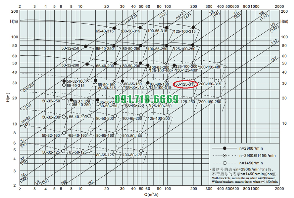 Đường cong hiệu suất của bơm li tâm cánh hở vỏ inox 316L model IHK150-125-315