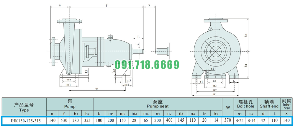 Kích thước lắp đặt của bơm li tâm cánh hở vỏ inox 316L model IHK150-125-315
