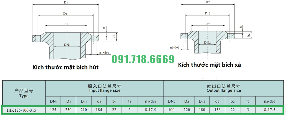 Kích thước mặt bích của bơm li tâm cánh hở vỏ inox 316L model IHK150-125-315