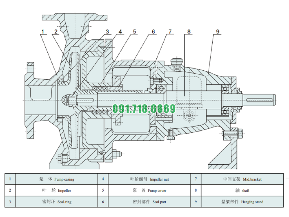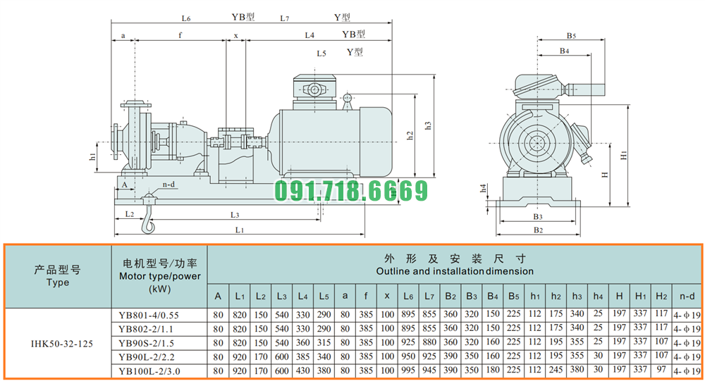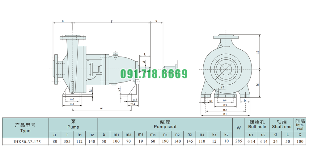 Kích thước lắp đặt của đầu bơm bơm li tâm cánh hở vỏ inox 316L model IHK50-32-125