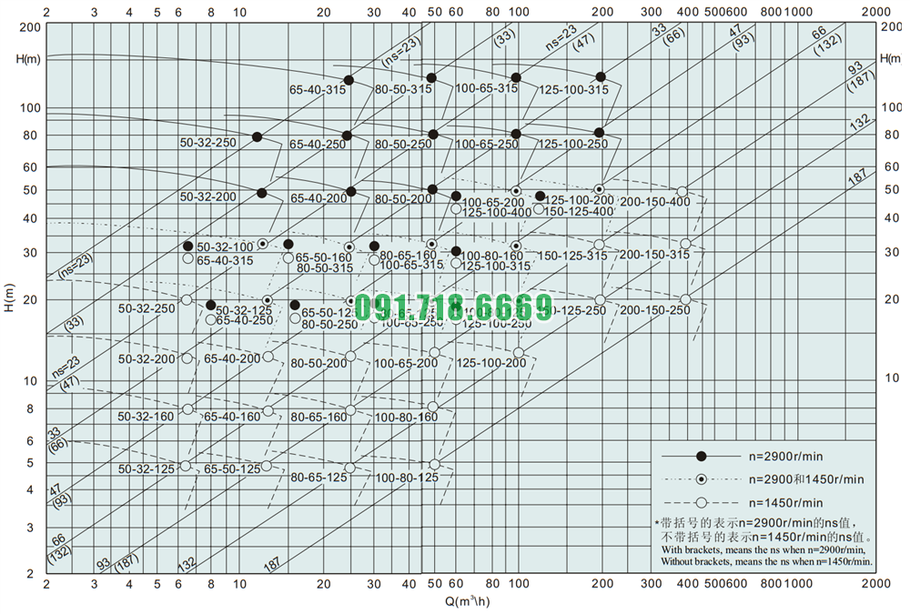 Đường cong hiệu suất làm việc của bơm li tâm cánh hở vỏ inox 316L model IHK50-32-125