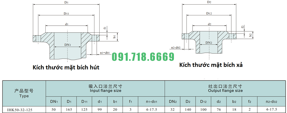 Kích thước mặt bích kết nối hút xả của bơm li tâm cánh hở vỏ inox 316L model IHK50-32-125