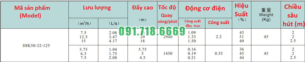 Bảng thông số lưu lượng của bơm li tâm cánh hở vỏ inox 316L model IHK50-32-125