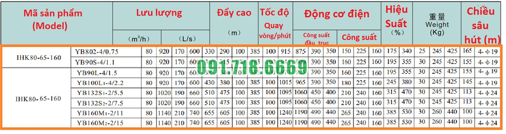 Bảng lưu lượng của bơm li tâm cánh hở vỏ inox 316L model IHK80-65-160
