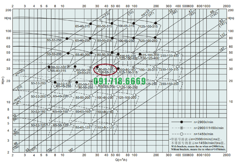 Đường cong hiệu suất của bơm li tâm cánh hở vỏ inox 316L model IHK80-65-160