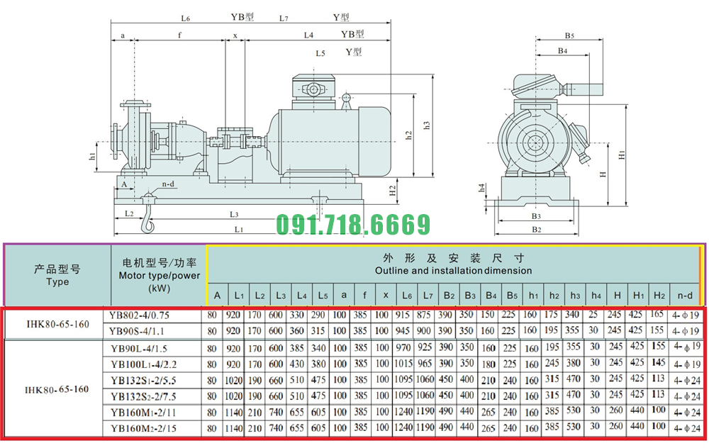 Kích thước lắp đặt của bơm li tâm cánh hở vỏ inox 316L model IHK80-65-160