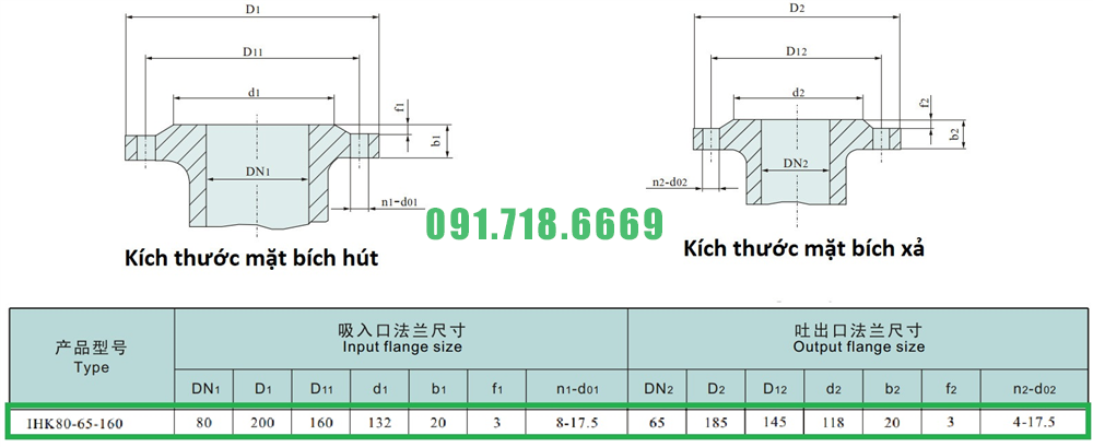 Kích thước mặt bích của bơm li tâm cánh hở vỏ inox 316L model IHK80-65-160
