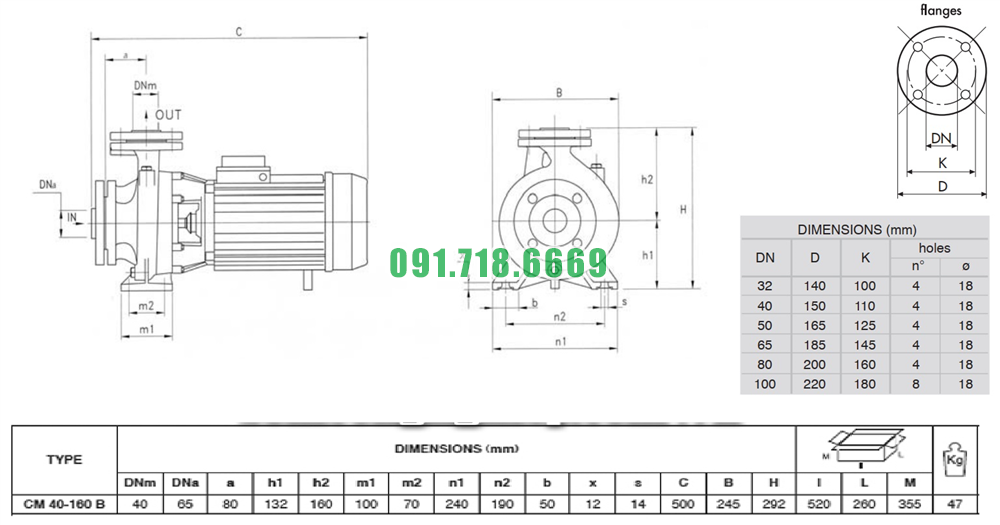 Kích thước bơm li tâm trục ngang đường thoát đầu vào ra Dn65 model CM40-160B