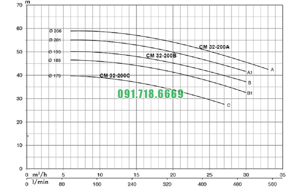 Đường cong lưu lượng bơm li tâm trục ngang vỏ gang FC200 model CM32-200B