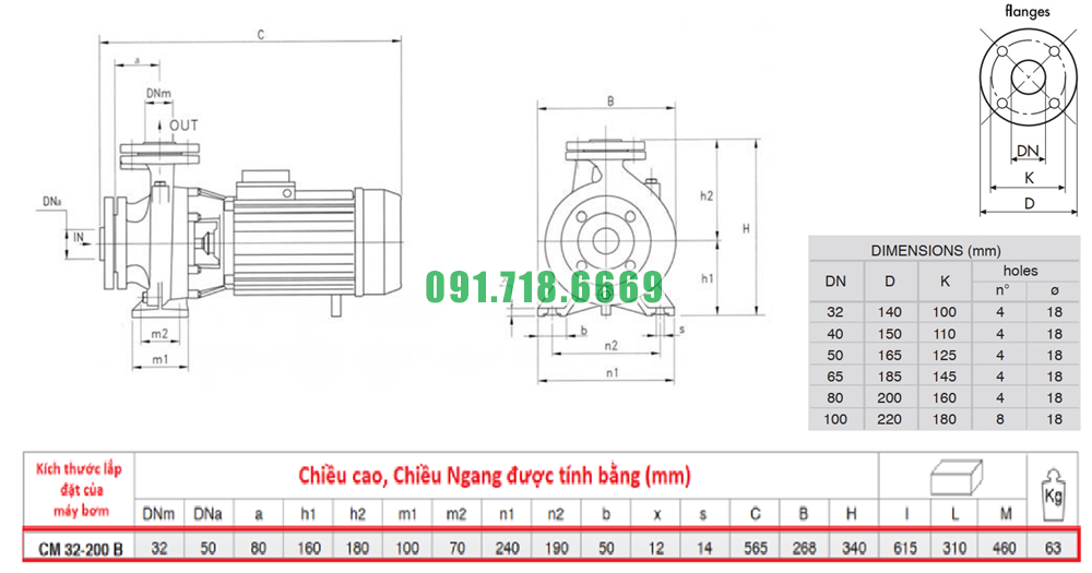 Kích thước bơm li tâm trục ngang vỏ gang FC200 model CM32-200B