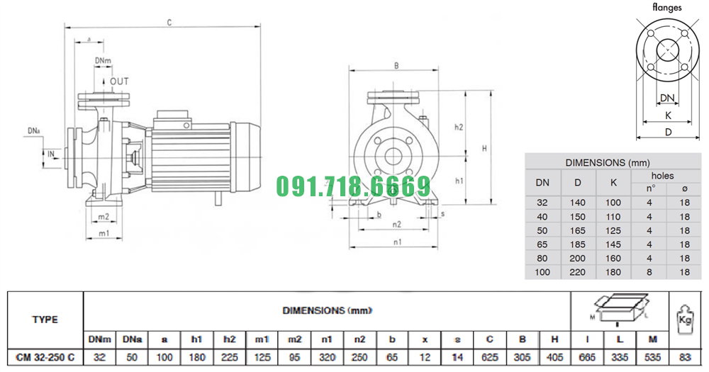 Kích thước bơm li tâm trục ngang vỏ gang FC200 model CM32-250C