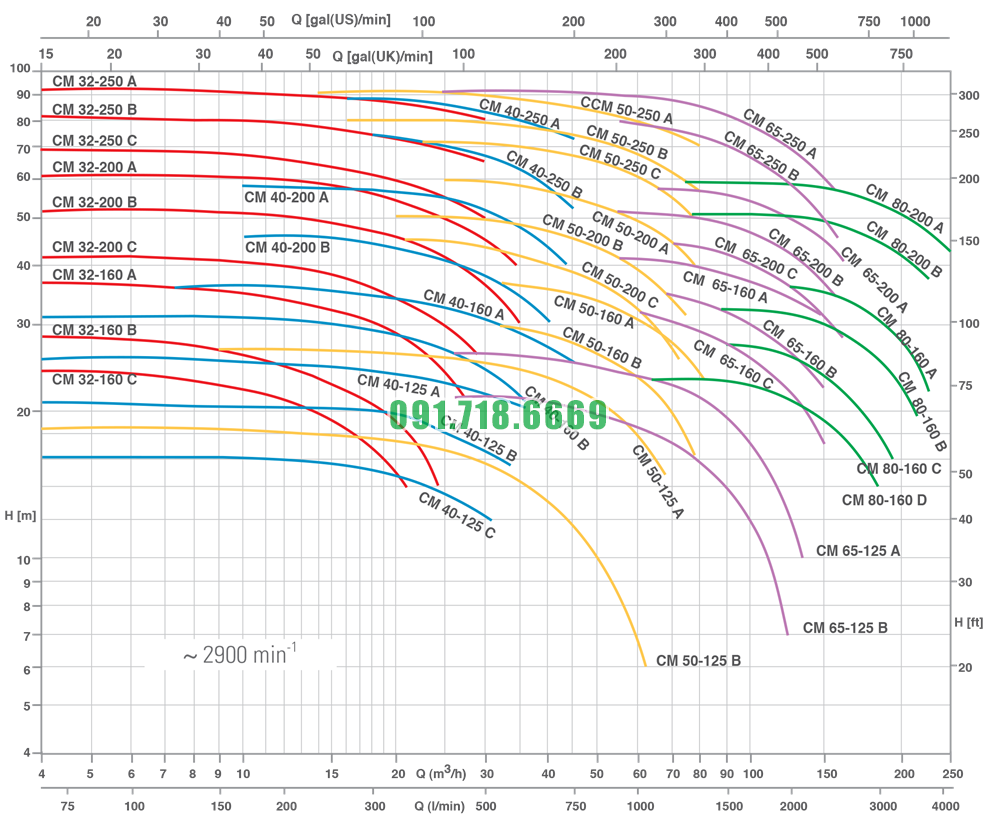 Đường cong hiệu suất bơm li tâm trục ngang vỏ gang FC200 model CM50-160A