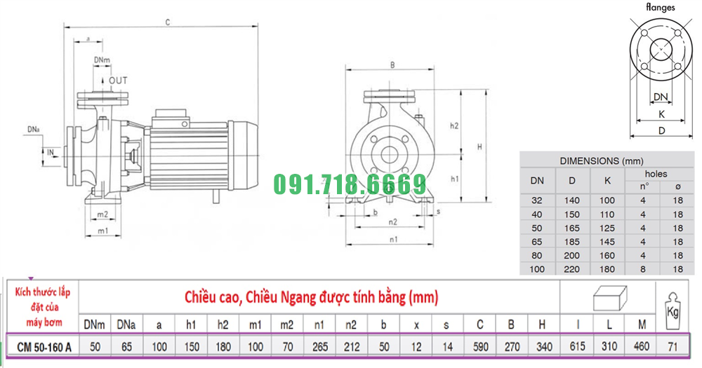 Kích thước bơm li tâm trục ngang vỏ gang FC200 model CM50-160A