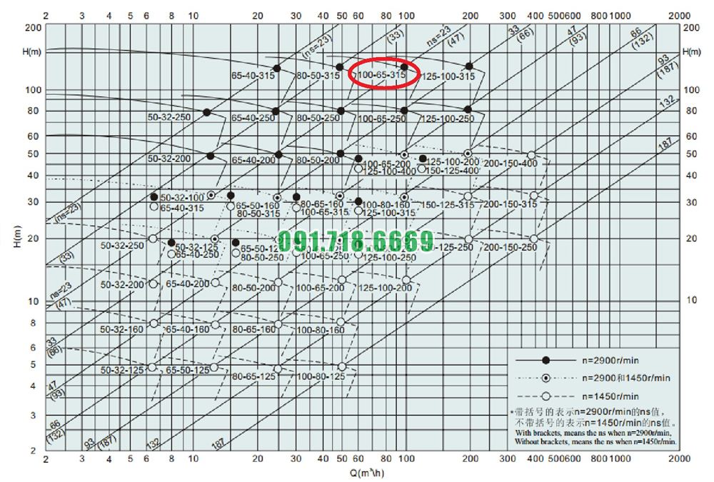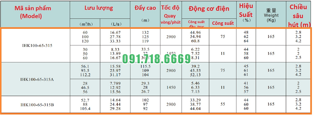 Bảng lưu lượng của máy bơm cánh hở li tâm trục ngang IHK100-65-315 đường thoát Dn100