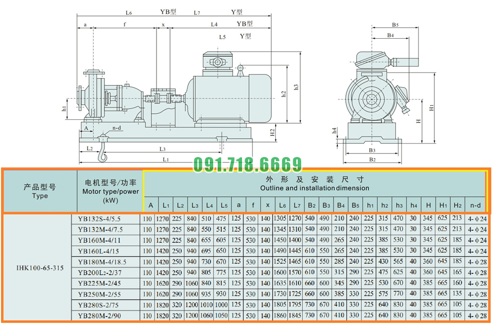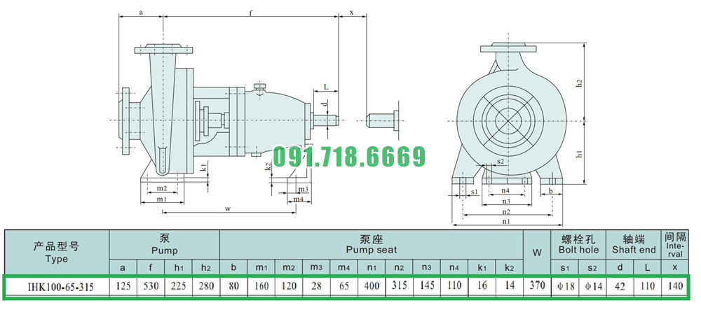 Kích thước của đầu máy bơm cánh hở li tâm trục ngang IHK100-65-315 đường thoát Dn100