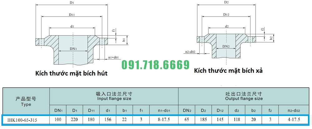 Kích thước mặt bích của máy bơm cánh hở li tâm trục ngang IHK100-65-315 đường thoát Dn100
