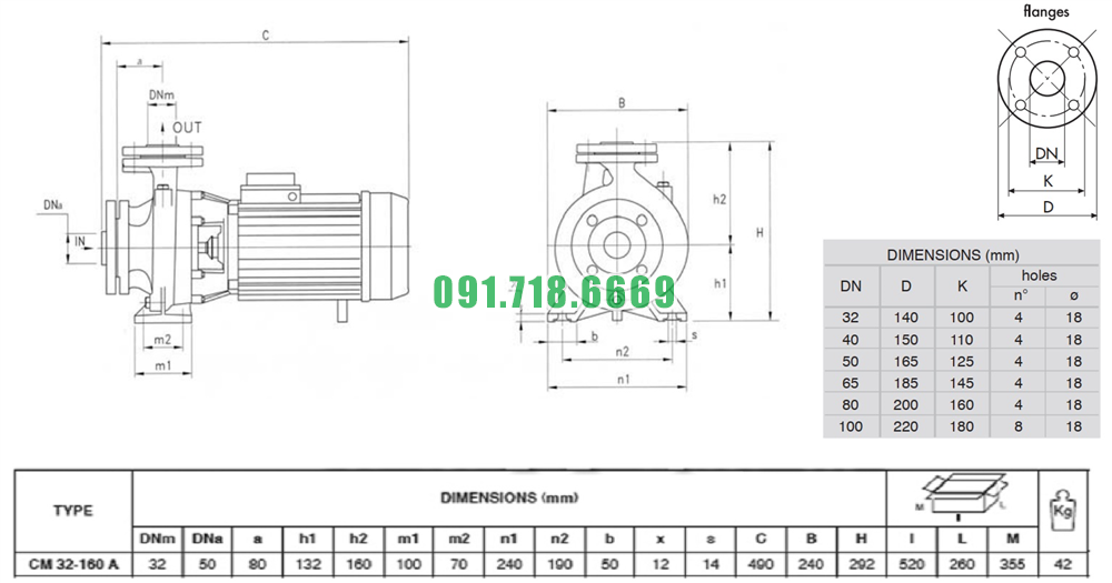 Kích thước máy bơm nước sạch li tâm trục ngang CM32-200C đường thoát 32 mm