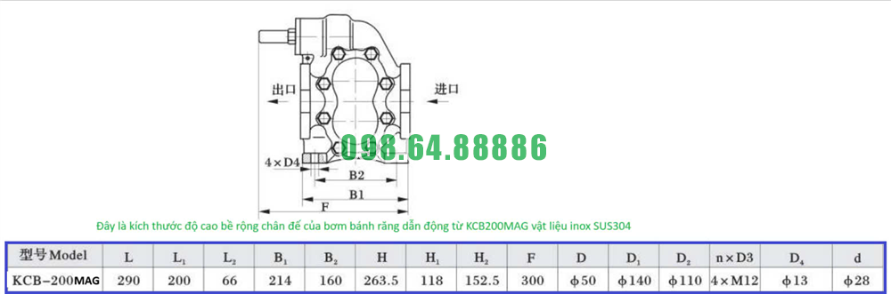 | KCB200 | Inox 304 | 12 m3/h | 38m | 4kw | Dn 50 mm |