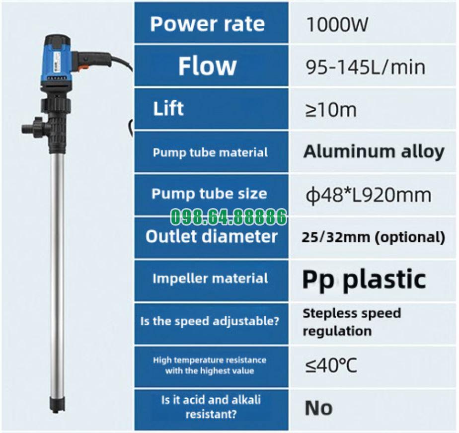 Bơm dầu thùng phuy JDT-1000W-L92 được chế tạo từ vật liệu có độ bền cao, giúp thiết bị chịu được điều kiện làm việc khắc nghiệt và hạn chế hư hỏng trong quá trình sử dụng.