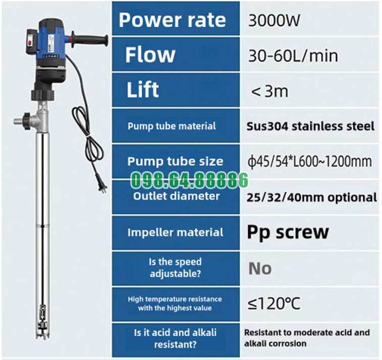 Một yếu tố quan trọng tạo nên độ bền của Máy bơm thùng phuy inox JDT-3000W-LGG120 là ống bơm được chế tạo từ thép không gỉ SUS304. Vật liệu này có khả năng chống gỉ sét, chống oxy hóa và hạn chế ăn mòn khi tiếp xúc với nhiều loại dung dịch công nghiệp.