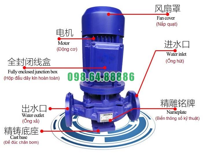 Máy bơm inline, bơm đồng trục đứng, bơm lùa ISG80-250A, IRG80-250A 18.5kw, 46.8m3, 70m