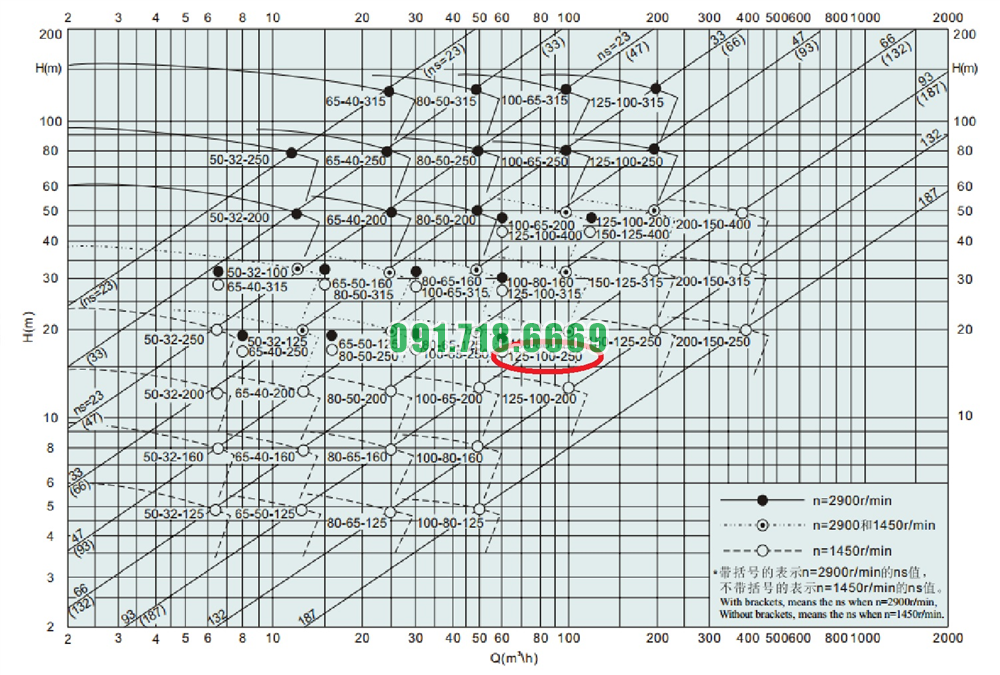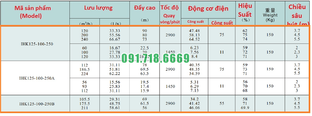 Bảng lưu lượng của máy bơm nước li tâm trục ngang cánh hở IHK125-100-250 động cơ điện 75 kw