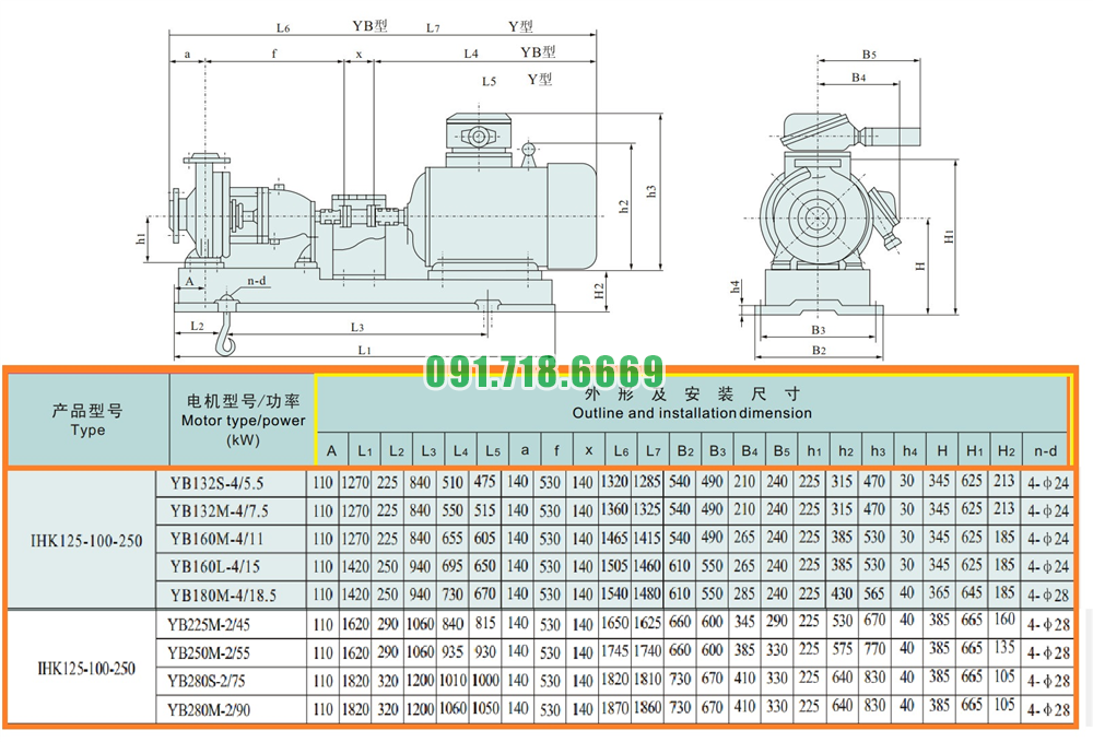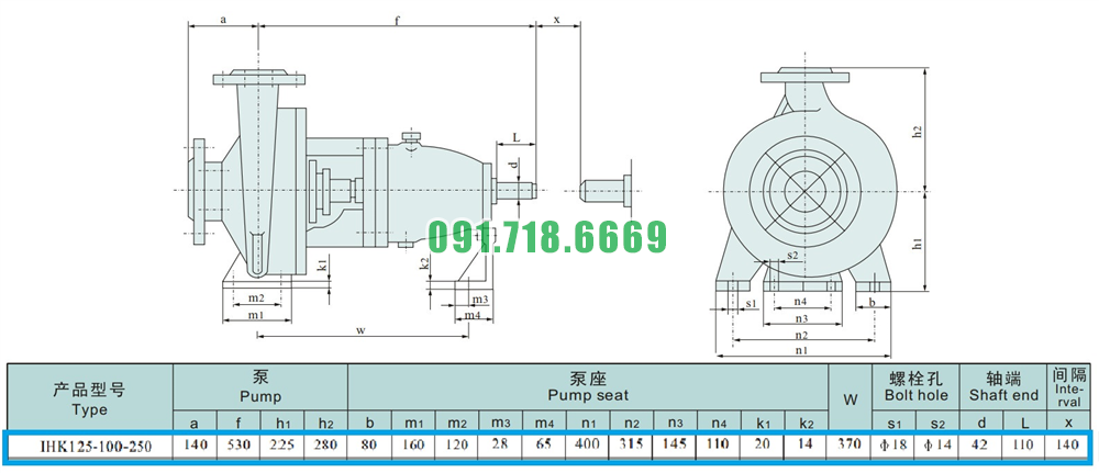 Kích thước của đầu máy bơm nước li tâm trục ngang cánh hở IHK125-100-250 động cơ điện 75 kw