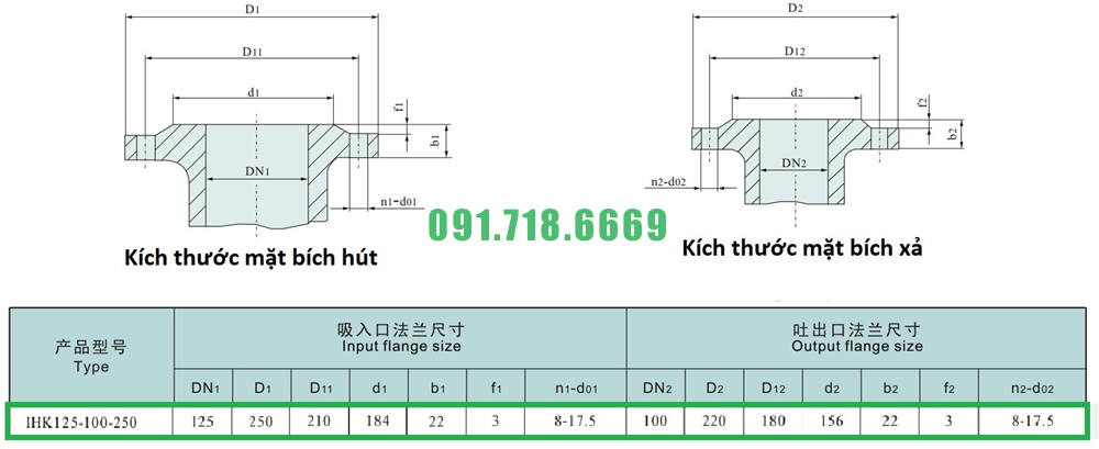 Kích thước mặt bích của máy bơm nước li tâm trục ngang cánh hở IHK125-100-250 động cơ điện 75 kw