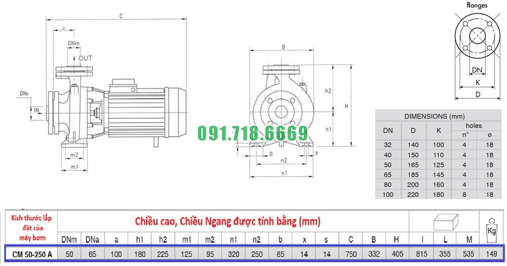 Kích thước máy bơm nước li tâm trục ngang CM50-250A vỏ gang FC200