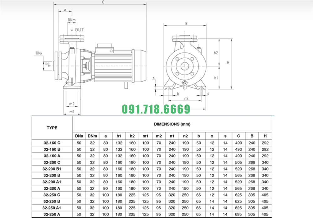 Kích thước máy bơm nước sạch li tâm trục ngang CM32-160C đường kính 32 mm